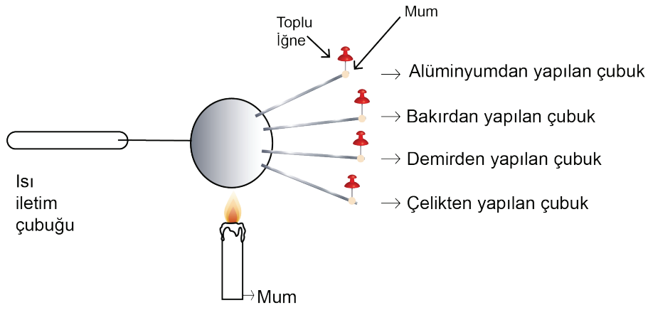 Isı iletim çubuğunu kullanarak deney yapmak isteyen bir öğrenci ısı iletim çubuğunun uçlarına mum damlatır. Mum damlalarının üzerine ise toplu iğneleri dik duracak şekilde yerleştirir. Daha sonra çubukların birleştiği arka kısma yanan bir mum temas ettirir ve iğnelerin yere düşme sürelerini ölçerek kaydeder. Isı iletkenliği : Bakır > aliminyum > demir > çelik