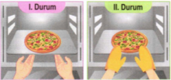Aykan Usta, fırında yaptığı pizzanın tepsisini çıkarırken I. durumda eldivensiz iken eli yanmış ve II. durumda bu yüzden eldiven kullanmıştır.