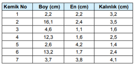 Arkeologlar yaptıkları kazı çalışmalarında bir canlı fosiline ulaşmıştır. Bu fosilin kemik özelliklerine bakarak hangi canlı türüne ait olduğunu belirlemek amacıyla fosilin farklı bölgelerinden aldıkları çeşitli kemiklere numaralar vermişlerdir. Kemiklerin en, boy ve kalınlıklarını ölçerek aşağıdaki gibi tabloya kaydetmişlerdir.