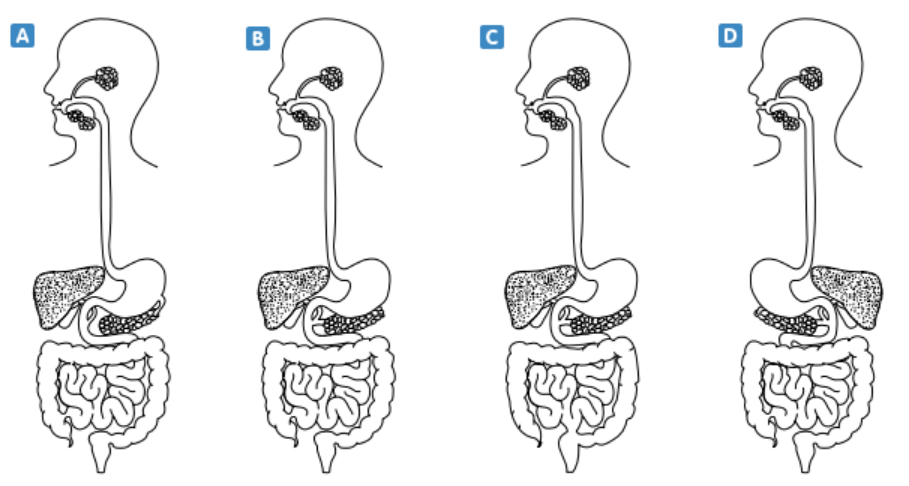Sindirim sistemine ait aşağıdaki şemalardan hangisi organların yeri ve birbirlerine bağlantıları bakımından doğru çizilmiştir ?