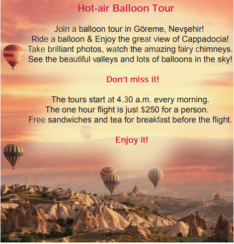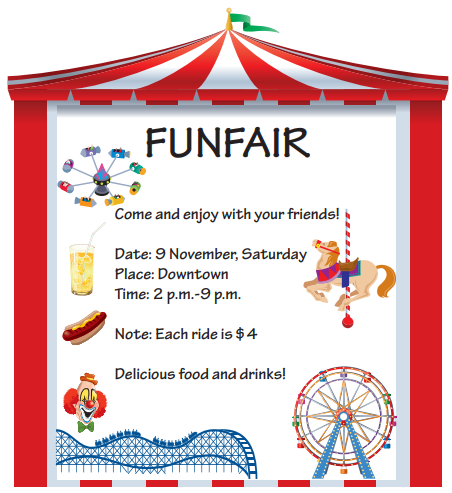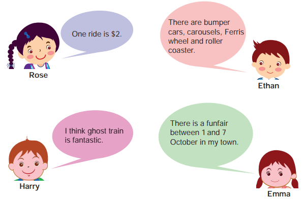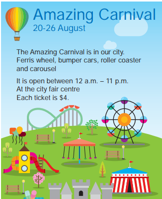There is a carnival in our city. It is in the Central Square between 19 October and 27 October. At the carnival, there are a lot of fun rides such as ghost trains, bumper cars, carousels and Ferris wheels. Each ride is $5.