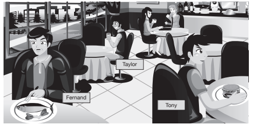 There are lots of people at the restaurant. - - - - likes drinking coffee. - - - - loves eating hamburger