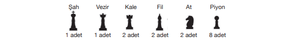 Satranç iki oyuncunun karşılıklı olarak oynadığı bir strateji oyunudur. Bu oyunda bir oyuncunun kullandığı taşlar şu şekildedir: