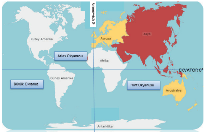 Haritaya göre, Asya Kıtası’nın coğrafi konumu ile ilgili aşağıdakilerden hangisi doğrudur?
