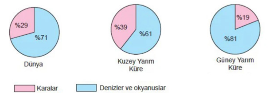 Aşağıdaki görsellerde, Dünya ile Kuzey ve Güney Yarım Kürelerde kara ve denizlerin dağılış oranları verilmiştir.