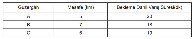Bir ilde bulunan taksilere binildiğinde taksimetre açılış ücreti 4 TL'dir. Gidilen her kilometre için 2,5 TL, trafikte hareketsiz kalınan her dakika için ise açılış ücretine 1 TL ilave edilmektedir. Bu ilde ulaşacağı yere taksi ile gitmek isteyen Aslı Hanım’a taksici, navigasyon cihazı aracılığıyla trafikteki yoğunluğa bağlı olarak aşağıda verilen 3 farklı güzergâh seçeneğini sunmuştur. Bu taksi hareket halindeyken her güzergâhta 1 km mesafeyi ortalama 2 dakikada almaktadır.