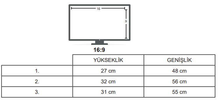 Buna göre yukarıda ekran ölçüleri verilen televizyonlardan hangileri 16:9 ekran ölçü oranına sahiptir?