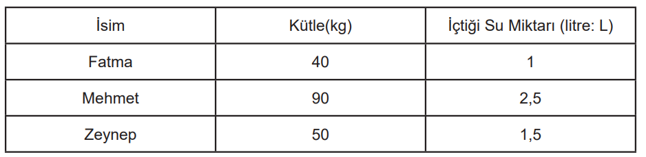 Dört kişinin kütleleri ve günlük içtikleri su miktarları aşağıda gösterilmiştir.