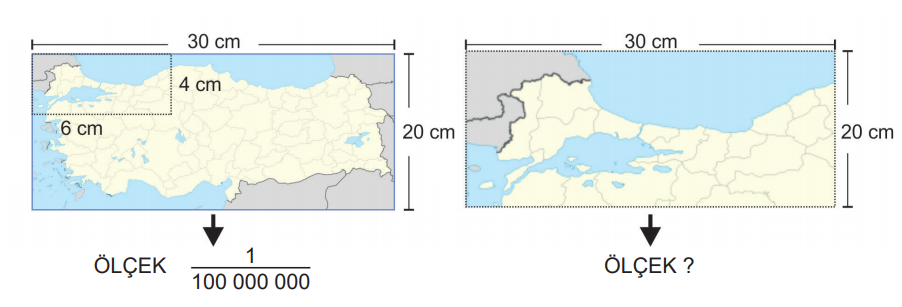 Sınırlanan bölgenin haritası, Türkiye haritası ile aynı boyutta çizilmek istendiğinde kullanılacak ölçek aşağıdakilerden hangisi olmalıdır?