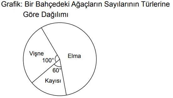 Aşağıdaki daire grafiğinde bir bahçedeki ağaçların sayılarının türlerine göre dağılımı verilmiştir.