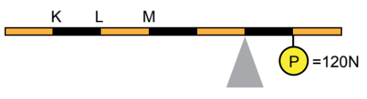 Şekildeki kaldıraçta 120 N’luk P yükünü dengelemek için, K, L, M noktalarından kuvvet uygulanıyor.