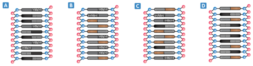 Aşağıda bir DNA molekülünde yer alan dört farklı nükleotidin sarmal yapıdaki eşleşmeleri şematize edilmiştir.