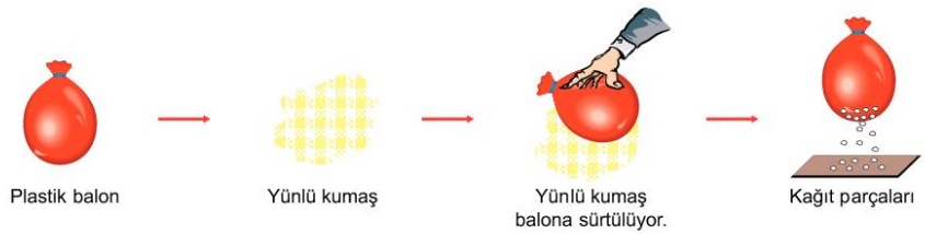 Yünlü kumaşa sürtülen balon (+) yükle yüklenmiş ve (-) yüklü kağıt parçalarını çekmiştir. |