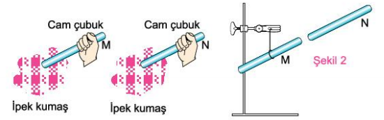Nur, özdeş M ve N cam çubukları ipek kumaşa sürüyor. Sonra bu çubukları Şekil 2’deki konuma getiriyor.