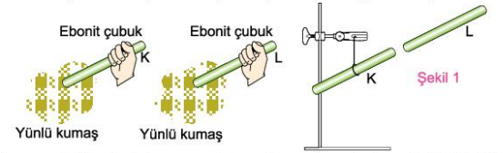 Ahmet, özdeş ebonit K ve L çubuklarını yün kumaşa sürüyor. Sonra bu çubukları Şekil 1’deki konuma getiriyor.