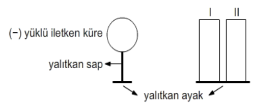 Nötr I ve II iletken levhaları yalıtkan ayak üzerinde birbirine değmeden şekildeki gibi paralel duruyorken (–) yüklü iletken küre yalıtkan sapından tutularak I levhasına değdirilirse levhalardaki yük dağılımı aşağıdakilerden hangisi olur?