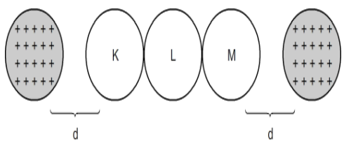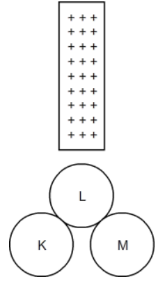 Eşit pozitif yüke sahip özdeş küreler iletken nötr K, L ve M iletken kürelere şekildeki gibi yaklaştırılmaktadır.