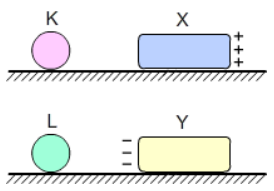 Yalıtkan zeminde bulunan, yüklü K ve L iletken küreleri; nötr X ve Y iletkenlerine yaklaştırıldığında X ve Y’nin birer ucundaki yük dağılımı şekildeki gibi oluyor.