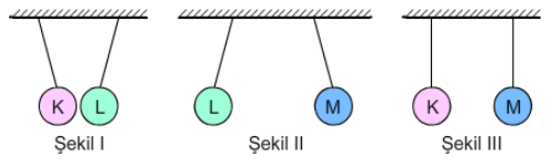 Her biri elektrik yükleri ile yüklü K, L ve M küreleri yalıtkan iplerle asılıdır. K ile L ve L ile M küreleri serbest bırakıldıklarında Şekil I ve Şekil II’deki gibi dengeye gelmektedir.