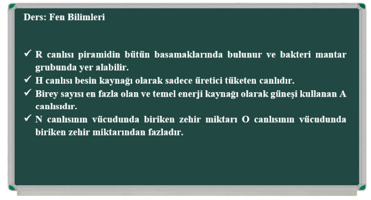 Öğretmen O, R, H, A ve N canlılarının özelliklerini vermiş ve öğrencilerinden bu canlıları ekoloji piramidine yerleştirmelerini istemiştir.