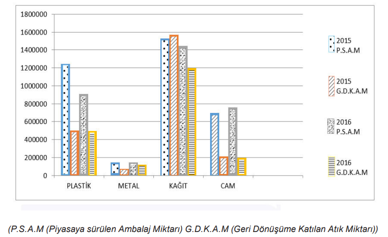 2015-2016 Yıllarında ülkemizde piyasaya sürülen bazı ambalaj miktarlarının ve bunların geri dönüşüme kazandırılma miktarlarının sayısal değerleri grafikte gösterilmiştir.