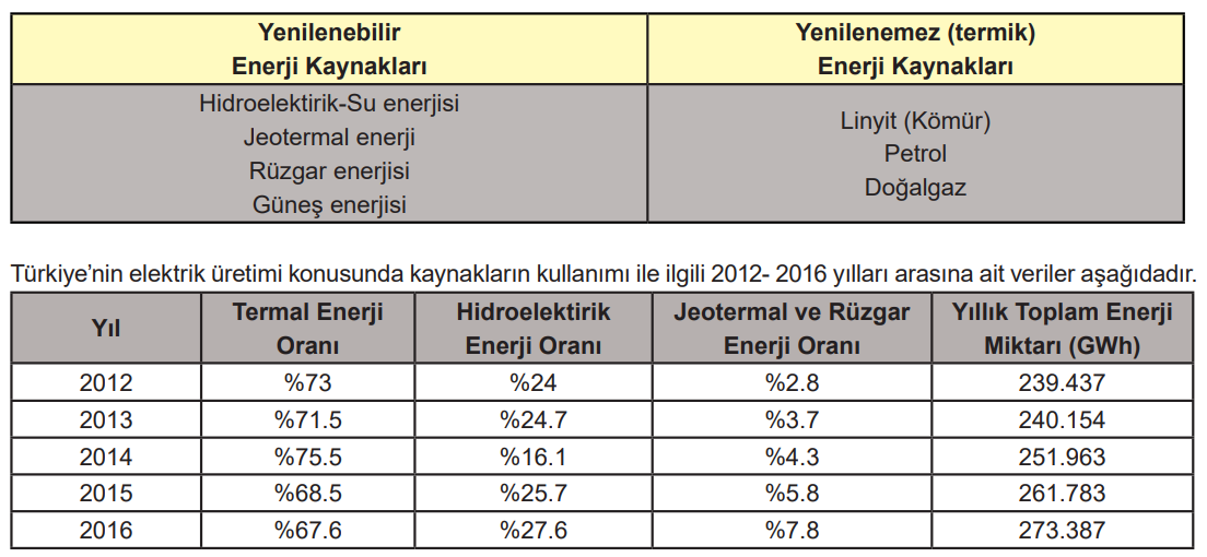 Türkiye de elektrik üretiminde kullanılan kaynaklar sınıflandırıldığında tabloda verilen gruplandırma ortaya çıkmaktadır.