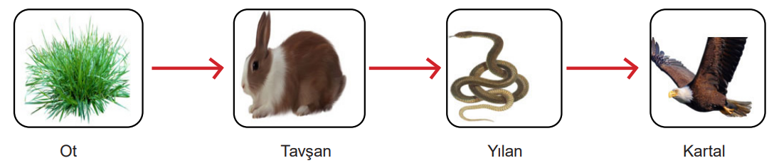 Bir ekosistemde bulunan canlıların birbiri ile beslenme ilişkisini gösteren besin zincirinin bir bölümü gösterilmiştir.