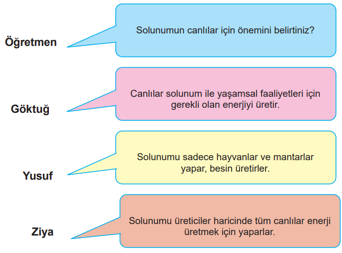 Fen öğretmeninin solunum konusunu işledikten sonra öğrencilerine sorduğu soru ve aldığı yanıtlar aşağıdaki gibidir.