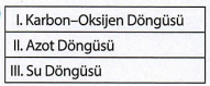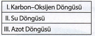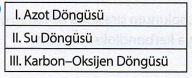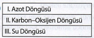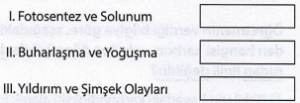 Aşağıda I, II ve III numara ile gösterilen olayların hangi madde döngülerinde etkili olduğu karşılarındaki kartlara yazılacaktır.
