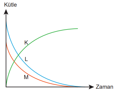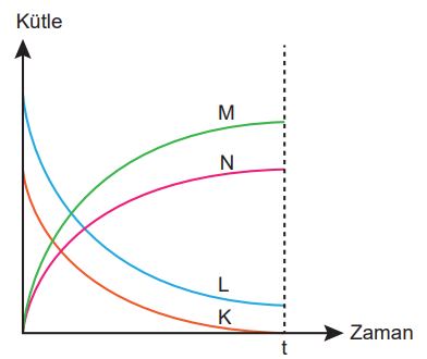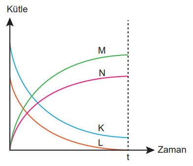 Bir kimyasal tepkimede K ve L maddelerinden M ve N maddeleri oluşuyor. t süresi sonunda kimyasal tepkimenin bittiği ve L maddesinden bir miktar arttığı biliniyor.