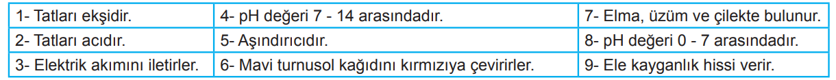 Aşağıdaki bilgilere dikkat edilerek öğrencilerin, sadece asitlere ait özellikleri seçmeleri isteniyor.