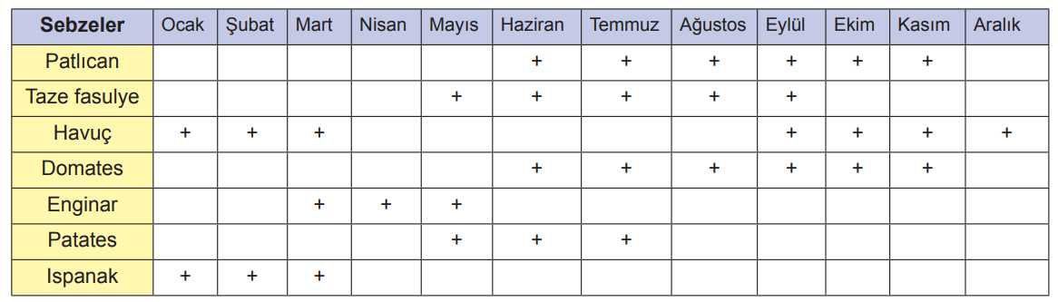 Meyve ve sebzelerin olgunlaşması için gerekli mevsim şartları önemlidir. Mevsiminde yetişen meyve ve sebzeler daha sağlıklı olur. Tabloda Kuzey yarım kürede bazı meyve ve sebzelerin olgunlaştığı aylar verilmiştir.