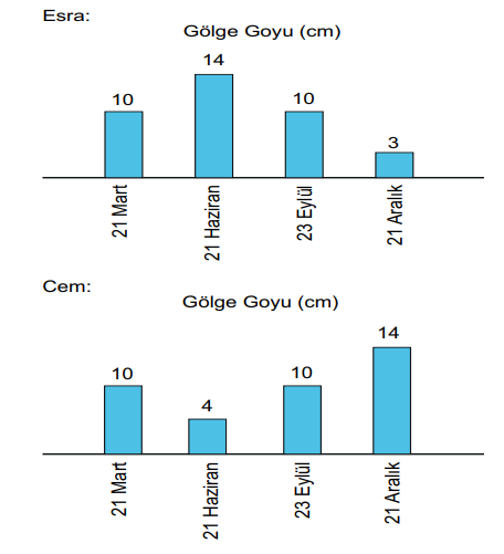 Esra ve Cem bir cismin 21 Mart, 21 Haziran, 23 Eylül ve 21 Aralık tarihlerinde öğlen vakti gölge boyunu ölçüp sonuçlarını grafiğe dönüştürmüşlerdir.