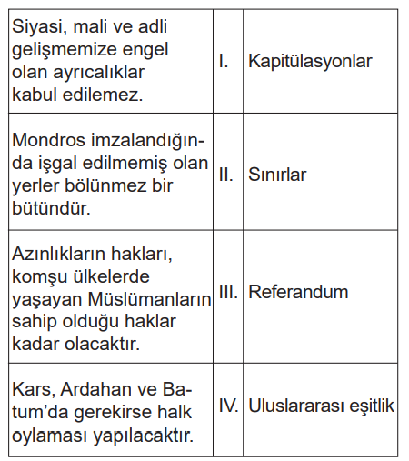Verilen tabloda Misak-ı Milli kararlarının ilgili olduğu alan eşleştirmeleri yapılmıştır, tablonun doğru olabilmesi için hangilerinin yer değiştirmesi gerekir?