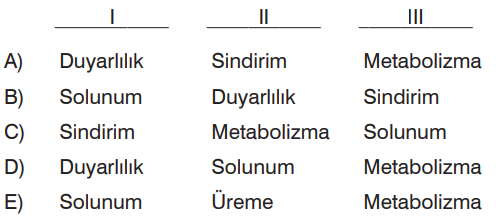 Yukarıda verilen canlılık özellikleri aşağıdakilerden hangisinde doğru olarak eşleştirilmiştir?