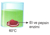 Alttaki düzenekte bir deney tüpünün içine belli bir miktar et parçası ve eti sindiren pepsin enzimi konulmuş ve 60°C'de bekletilmiştir.
