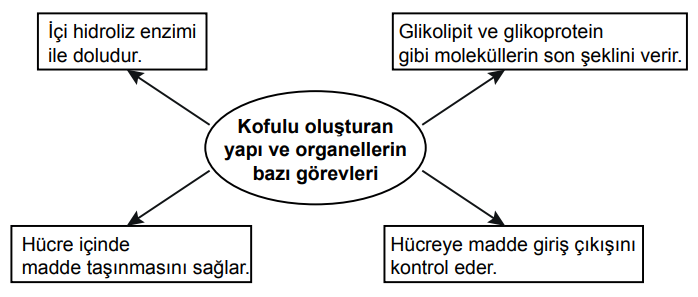 Farklı görevleri üstlenen tek zarlı organel olan kofulun bazı çeşitlerinin işlevleri verilmiştir.