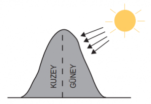 Görselde bir dağın iki farklı yamacının Güneş’e karşı konumları gösterilmiştir.
