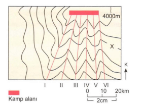 Topoğrafya haritasında 'X' ile gösterilen yere 3800 metre yazılırsa kamp alanından inmek isteyen dağcıların sırtları takip ederek izlemesi gereken güzergahlar aşağıdaki seçeneklerin hangisinde doğru olarak verilmiştir?
