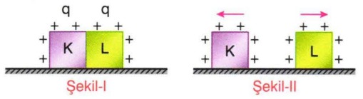 gibi birbirine dokunan özdeş K, L cisimleri serbest bırakıldığında Şekil-II deki gibi birbirlerinden ayrılıyorlar.