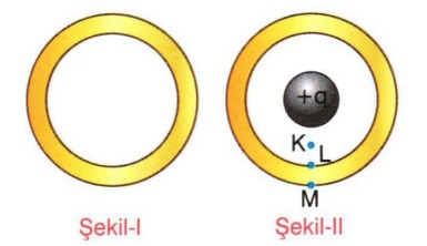 Şekil-1 de içi boş ve nötr iletken kürenin içine dokundurulmadan +q yüklü bir başka küre Şekil-il deki gibi