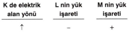 Buna göre, K noktasının elektrik alan yönü ve L, M noktalarının yük işaretleri ne olur?