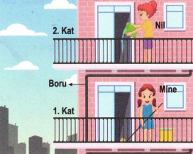 Nil ve Mine Hanım, özdeş büyüklükteki balkonlarında yerdeki tozları balkondan uzaklaştırmak için yere su dökmüşlerdir.