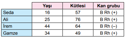 Bazı kişilere ait özellikler tabloda verilmiştir.