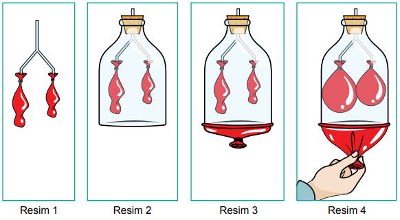 Resim 4 soluk alma olayını gösterdiğinden seçilen pet şişe sebebiyle göğüs boşluğunun hacmi artmamış ve hata yapılmıştır. | |