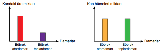Sağlıklı bir insanın böbrek atardamarı ile böbrek toplardamarındaki üre ve kan hücreleri miktarına ait grafikler yukarıdaki gibidir.