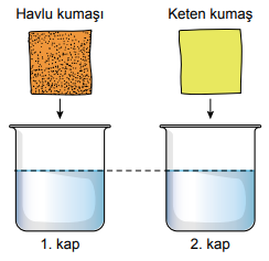Bu iki kumaştan 20×20 cm boyutunda örnekler alınarak içerisinde 1’er litre su bulunan dereceli kaplara şekildeki gibi batırılıyor.