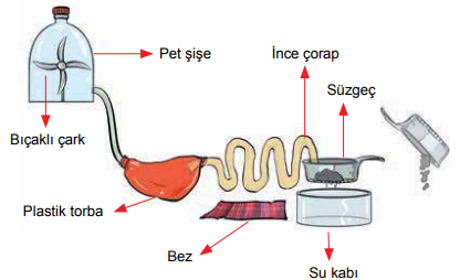 Aşağıdaki düzenekte günlük hayatta kullanılan malzemeler ile insan sindirim sistemi modellenmiştir.