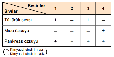 Yandaki dört bölüme ayrılmış kabın içerisinde bazı besin içerikleri bulunmaktadır. Bu besinlerin üzerine sindirim sisteminde yer alan sıvılar damlatılmış ve kimyasal sindirimin gerçekleşip gerçekleşmediği gözlenmiştir. Sonuca ilişkin veriler tabloda verilmiştir.