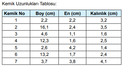 Arkeologlar yaptıkları kazı çalışmalarında bir canlı fosiline ulaşmıştır. Bu fosilin kemik özelliklerine bakarak hangi canlı türüne ait olduğunu belirlemek amacıyla fosilin farklı bölgelerinden aldıkları çeşitli kemiklere numaralar vermişlerdir. Kemiklerin en, boy ve kalınlıklarını ölçerek aşağıdaki gibi tabloya kaydetmişlerdir.